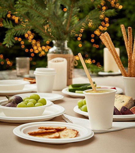 Plates, Trays, Bowls, Clamshells — made from sugarcane pulp, 100% compostable and durable.