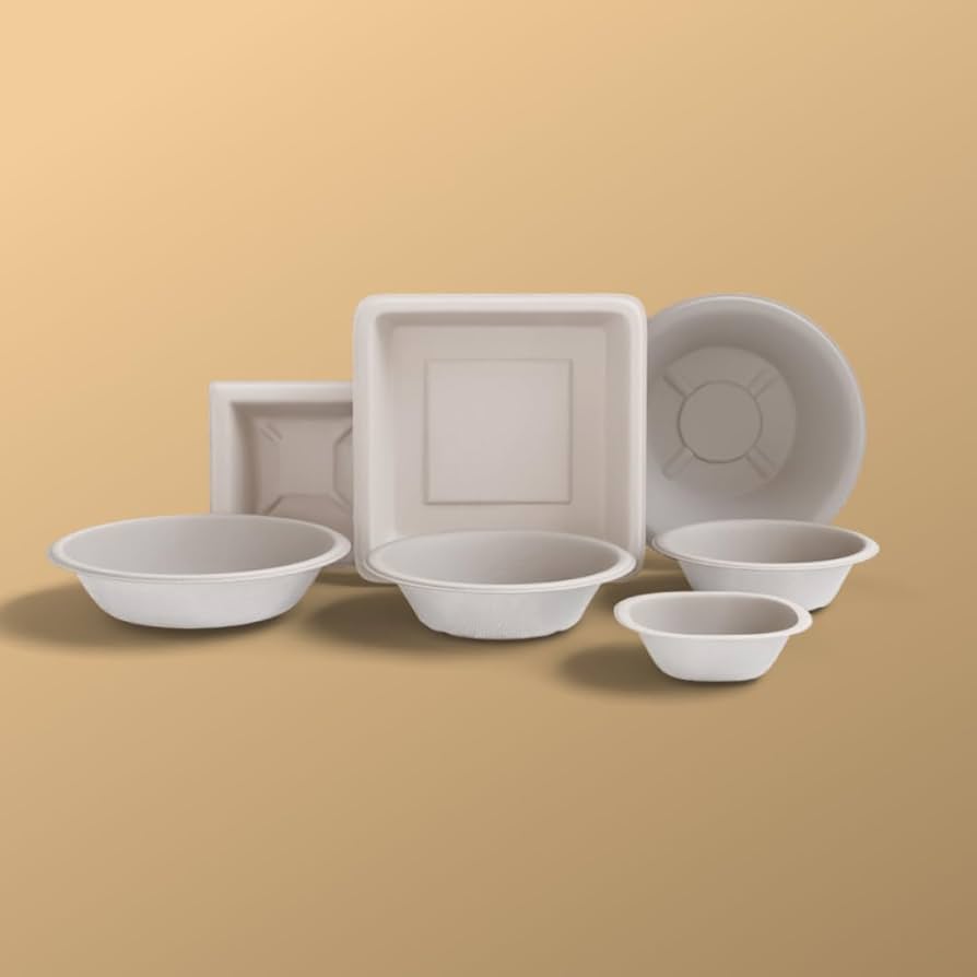 Eco-friendly round plates in multiple sizes (6"–12") with plain or multi-compartment designs. Strong, oil & water-resistant, ideal for dine-in and takeaway meals.